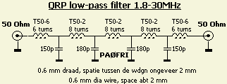 Omdat ringkernen een minimaal uitwendig veld hebben, kan alles dicht bij elkaar geplaatst worden zodat het filter nog compacter wordt dan het testmodel op de foto. Neem voor een QRP zender draad van 0.6 mm diameter of een dikkere soort. De dikte wordt min of meer bepaald door uw vaardigheid om alles op de ringkern te wikkelen en niet te breken. Een ringkern kent geen halve of nog kortere windingen, één draad erdoor en u heeft één winding.