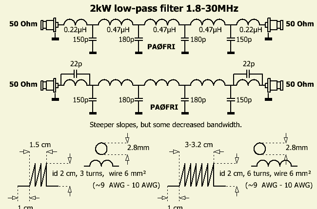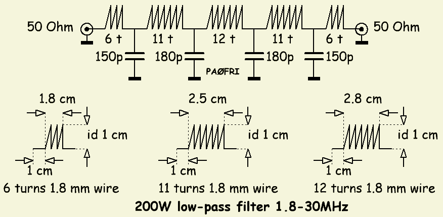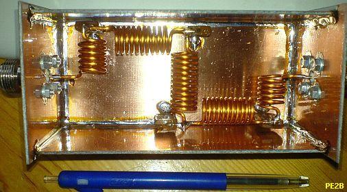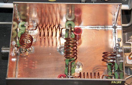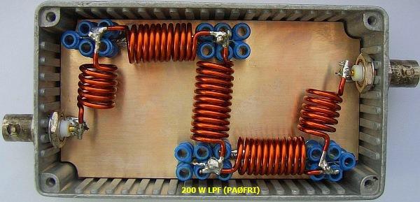 Dit filter («fig) is goed voor 200 W. Met 1 kW werden de spoelen lauwwarm. De afmetingen van het gietaluminium doosje zijn l × b × h, 11.2 × 6.3 × 2.8 cm. Op een laboratorium van een technische universiteit werd de filterdoorlaat gemeten. De wetenschappers waren verbaasd dat er, zonder onderlinge afscherming en met de spoelen zo dicht bij boven en onderkant, toch zo'n goed resultaat bereikt werd. Zie de grafieken verder in dit artikel.