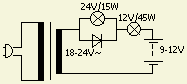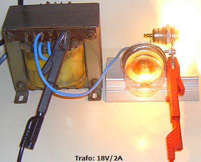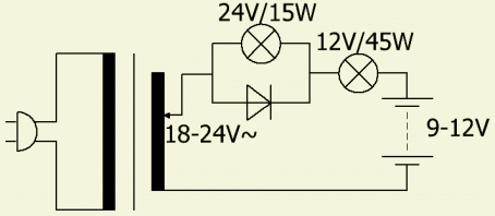 Voor een gemiddelde laadstroom van ongeveer 1 à 2 Amp wordt meestal de afgebeelde opstelling en het schema hiernaast gebruikt. De diode is op het koelblok gemonteerd. De autolampen zorgen min of meer voor een stroombegrenzing en dienen ook als indicatie. Als een accu aanvankelijk geen stroom opneemt, brandt alleen de kleine lamp. Gaandeweg gaat de grote lamp gloeien zodat men weet dat de eigenlijke lading begint.
