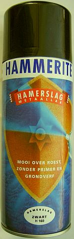 Met HAMMERITE worden en werden hier tuingereedschap en andere roestige metalen objecten met een kwast van een beschermlaag voorzien omdat het product direct over roest aangebracht kan worden en geen grondverf nodig is. Omdat er naar ik gehoord heb glas of zanddeeltjes in het product verwerkt zijn, heeft deze laksoort een uithardingtijd van ongeveer zes weken nodig. Dat is voor het zelf bewerken van een kast een lage tijd waar velen onder ons geen geduld voor hebben. Nu heeft dat merk spuitbussen met een hamerslag spray op de markt gebracht. Dat heeft ook een lange tijd voor het uitharden of aanbrengen van nieuwe laklagen nodig.