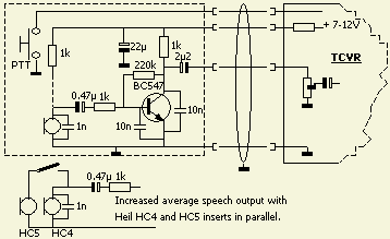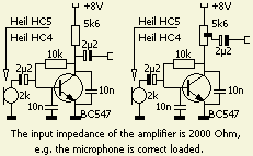 Voor HeiL HC4 en HC5 kapsels werd een versterker (fig») gemaakt met voor de microfoon een correcte impedantie aan de ingang. De versterking is niet zo groot als de eerder getoonde schakeling omdat het dan net teveel was voor mijn Ten Tec Corsair II.
