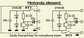 Zo ook bij één van mijn sets en dan is het met drie draden een probleem als een microfoon een voorspanning moet hebben. Gelukkig is er een oude truc om toch een kleine voorspanning te verkrijgen. De meeste zend en ontvangrelais werken ook met een iets lagere spanning en daarvan wordt in (fig») deze schakeling gebruik gemaakt. In het microfoonhuis brengt men in de toevoer naar de PTT schakelaar twee diodes in serie aan. De spanningsval wordt via een weerstand naar het microfoonkapsel gelegd. Deze methode werkt uitstekend met het afgebeelde element van Motorola. Om HF inspraak te voorkomen moet het metalen huis aan de min-pool geaard worden!