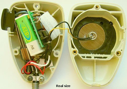 Een microfoon zomaar ergens in een behuizing plaatsen vraagt meestal om ellende, omdat de ruimte als klankkast de modulatie benadeelt. Daarom is de electret gemonteerd in een frontplaatje, zodat de spraak alleen in de microfoon belandt.