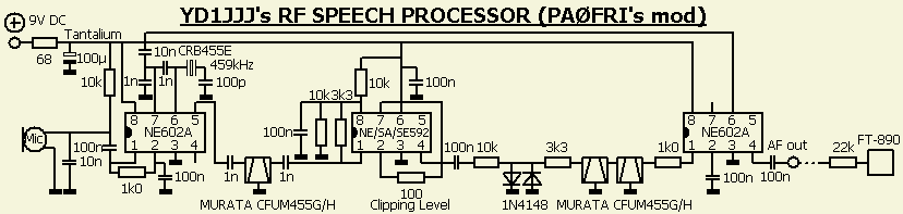 YD1JJJ heeft een opvallende en eenvoudige processor bedacht. Het geringe formaat is te danken aan zijn zoektocht naar een zo klein mogelijk filter: MURATA CFUM455G! Het ontwerp dat misschien door u licht aangepast moet worden, werkt zeer effectief. Een voorbeeld: de ventilator van mijn FT-890 gaat veel eerder aan; hetgeen betekent dat het gemiddelde zendvermogen (fig») toegenomen is.