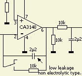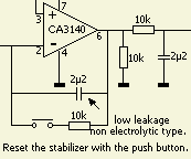 Op pin 3 van CA3140 («fig) staat de halve voedingsspanning. Als de spanning op pin 2 daarvan afwijkt versterkt de operationele versterker de verandering. De 2.2 μF condensator (pin 2 en 6) wordt opgeladen en verliest slechts langzaam zijn lading door de hoge ingangsimpedantie van de versterker en de twee 4.7 MΩ weerstanden. Als er erg veel aan de VFO gedraaid wordt, gaat de spanning op pin 6 steeds meer afwijken van de halve voedingsspanning. De VFO blijft echter gestabiliseerd.