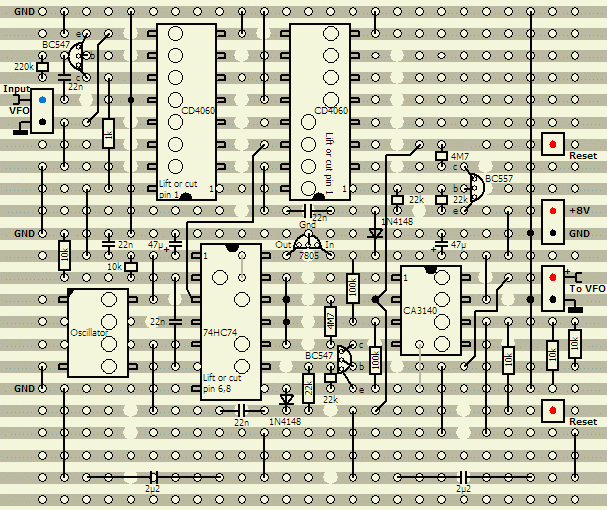 Een eenvoudige voorversterker met een BC547 (fig») was nodig omdat sommige VFO’s net niet genoeg signaal gaven om de eerste, van een print uitgesoldeerde deler, MC14060BCP te sturen. Dat kan vastgesteld worden door op pin 6 een scoop aan te sluiten. Een brede band van ongeveer 4 V top-top moet te zien zijn. Ook de pinnen 14 en 15 van de tweede deler zijn zo te testen op de goede werking van dat IC. Een voorversterker werkt daarbij ook als scheidingstrap of buffer achter een VFO. Kies eventueel, in plaats van een 220 k weerstand, een andere waarde zodat de collectorspanning 2.5 V wordt.