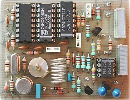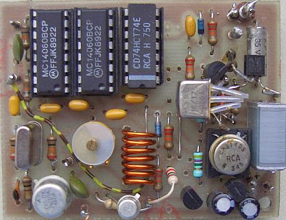 De kristaloscillator was een overtone type met een afgestemde kring in de collector. De instelling en de sturing naar 74HC74 bleken nogal kritisch te zijn. Misschien ook omdat hier al jaren onderdelen gerecykeld worden van afgedankte consumenten elektronica. Toen de andere helft van een 74HC74 gebruikt werd om de overtone oscillator door twee te delen, was het probleem opgelost (door de blokspanning uit de deler). Deze extra deling is in dit ontwerp niet aangebracht omdat het met de volgende oscillator niet nodig was.