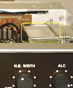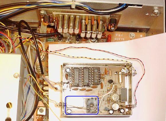 Op de PAØCMU's print kan de blokoscillator (fig») gemonteerd worden in de ruimte (blauw kader) van de oorspronkelijke overtone oscillator. Ernaast is plaats voor een op zijn kop gelijmd relais. Eventueel moet in de VFO de condensator van 10 – 22 pF tijdelijk vervangen worden door een trimmer om het regelbereik in te stellen. Blik de stabilisator in met doorvoer condensatoren om ongewenste stoorstraling in de ontvanger te voorkomen. Op de foto is de tijdelijk geopende stabilisator te zien in mijn Ten Tec Corsair II. |
