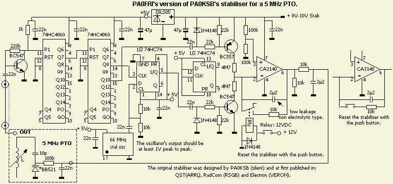 PA0KSB beschrijft uitgebreid de relatie tussen het delen, VFO en oscillatorfrequentie. In de praktijk bleken VFO’s van 5 – 9 MHz goed te stabiliseren met oscillators van 28 – 66 MHz zonder de getekende deelinstelling te veranderen. In mijn huidige 5 MHz PTO zit een 66 MHz oscillator die gekocht werd tijdens een vlooienmarkt op bij een Dag van de Amateur. Hoe hoger de frequentie hoe dichter de referentie c.q. stabilisatie punten bij elkaar komen. Volg de berekening in het artikel van Klaas als u wilt dat de stabilisatiepunten optimaal worden.