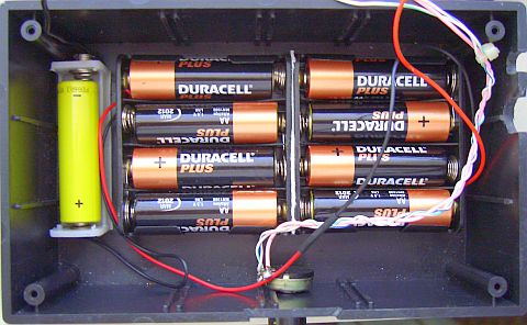 De werking van de analysator wordt minder nauwkeurig naarmate de voedingsspanning lager wordt. Daarom is het beter om geen diode in serie met de voeding te zetten, maar een andere beveiliging met een kortsluitdiode aan te brengen (zie vorige schema). De zekering van 200 mA is gebaseerd op het totale gebruik inclusief een verlichting van het LCD schermpje. Nog beter is het om ook de 12 V voedingsspanning te stabiliseren of een stabiele externe voeding te gebruiken en bij die spanning de afregeling uit te voeren. Om ook met batterijen een spanning te behouden van om en nabij de 12 V, werd een extra batterijhouder («fig) in het kastje geplaatst.