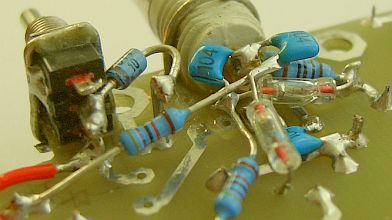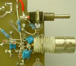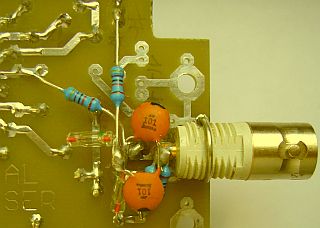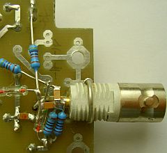 Oorspronkelijk zijn de uitgangsklemmen («fig) gewone rode en zwarte stekkerbussen, maar mijn persoonlijk voorkeur is een coaxiaal systeem. Dat werd een aangepaste en gelijmde BNC connector (fig») en de "kritische" componenten (D5 etc. D6 etc. 2 × 100 Ω) werden volgens een ouderwetse methode op of rond het chassisdeel gemonteerd.