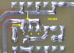 Daarom is de als experiment uitgevoerde wijziging toch permanent geworden. Het aanbrengen is gemakkelijk. Pinnen 4 en 5 zitten al aan elkaar. Alleen het spoortje van pinnen 4 en 5 naar pin 14 van 74LS93 moet doorgekrast worden en daarna soldeert men pin 6 met een paar mm draad aan dat spoortje.