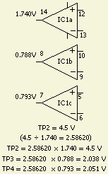 De spanning op de pinnen 7, 8 en 14 kan bij u anders zijn, maar voor de juiste spanning op TP3 en TP4 past u de berekening aan met een (andere) vermenigvuldigingsfactor 4.5 ÷ Upin14.