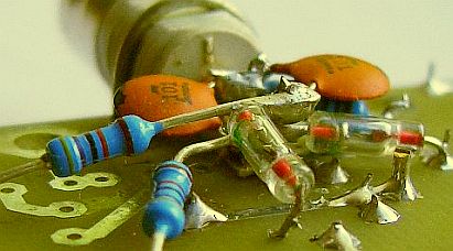 De toch wel kleine weerstanden zijn gecodeerd met 5 gekleurde streepjes en het onderscheid tussen bij voorbeeld rood, oranje en bruin is marginaal. Ondanks mijn ervaring op dat gebied monteerde ik toch een 47 kΩ weerstand op de plaats van een 4.7 kΩ type. Gelukkig werd dat bijtijds ontdekt zodat het fout zoeken in een later stadium niet nodig was. Gebruik voor de zekerheid een universeelmeter met een Ohm bereik bij het selecteren van de componenten