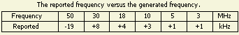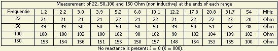 De frequentie weergave op het display wijkt af van de werkelijke opgewekte frequentie en in de tabel wordt het verschil getoond. Een paar reflectievrije weerstanden (22, 50, 100 en 150 Ω) werden gemeten op de hoogste en laagste frequentie in elk bereik van de bandschakelaar.