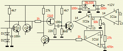 Om de stabiliteit van een generator niet aan te tasten, is een ALC direct op een oscillator minder geslaagd. Een regeling van de bufferversterker lijkt mij daarom beter. Q9 en Q10 vormen samen een cascode schakeling waarbij de basis van Q10 voor HF ontkoppeld is. Deze transistor werkt in geaarde basisschakeling met een lage ingangsimpedantie. Één van de mogelijkheden om de versterking te regelen ziet u in het schema (fig»). Het signaal op TP1 wordt met IC1a en IC1d versterkt en via een 1 kΩ weerstand komen beide diodes (1N4148) in geleiding waardoor het signaal aan de ingang (emitter) van Q10 verminderd of kortgesloten wordt. Het signaal op TP1 behoudt zijn sinusvorm.