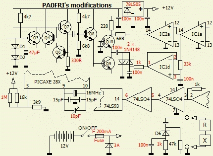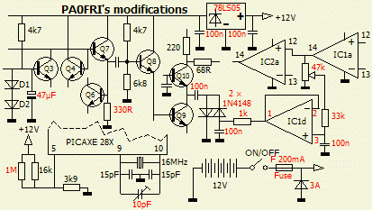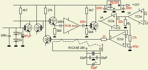 Zelf dacht ik aanvankelijk meer aan een buffer (fig») in de vorm van een MAR type versterker. Dan hoeft er iets minder aan de printsporen gemorreld te worden. Het totaal aantal wijzigingen zou er dan uitzien volgens het schema. Later bleek het toevoegen van een MAR versterker tussen Q7 en Q8 niet zo'n succes te zijn, hetgeen ook zo was met andere extra discrete versterkers. De spanning op TP1 wordt te hoog en dat is kennelijk teveel voor de berekeningen in de PIC processor.
