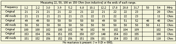 Bij het meten van reflectievrije weerstanden van 15, 50 en 150 Ω verschijnen er op het display nogal uiteenlopende uitkomsten over de diverse bereiken van de bandschakelaar. Bovendien wordt veelvuldig een blindweerstand weergegeven terwijl dat eigenlijk niet zou moeten. Waarschijnlijk komt dat door de spreiding van de componenten in het meetcircuit, maar na veel experimenteren met afregelen denk ik dat het een andere oorzaak heeft.