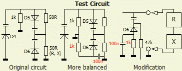 In het testcircuit zal dat de stroom door D5 anders zal zijn dan door D6 (ID5 ≠ ID6) want er staat een 1 kΩ weerstand mee in serie. In het ontwerp wordt ervan uitgegaan dat bij een 50 Ω belasting op de uitgangsklemmen beide diodes D5 en D6 een gelijke spanning afgeven. Alleen als het systeem in balans is (fig»), zal dat gelijk zijn en dan moet er ook een 1 kΩ weerstand in serie met D6 geplaatst worden. De spanning die D4, D5 en D6 afgeven moet gemeten worden op respectievelijk pinnen 14 (TP14), 8 (TP8) en 7 (TP7) van IC1a. Bij mij was TP7 niet gelijk aan TP8 ( TP7 ≠ TP8) en beide waren niet de helft van TP14 (TP3 ≠ TP4 ≠ ½ TP14). Door deze modificatie is in mijn meetinstrument de spanning die D6 afgeeft vrijwel gelijk aan de halve spanning van D4 (TP7 = ½ TP14), maar TP7 is nog steeds niet gelijk aan TP8 (TP7 ≠ TP8). Waarschijnlijk wordt dat beter als twee uitgezochte en gelijke germanium diodes gemonteerd worden (en misschien moet er ook 1 kΩ in serie met D4).