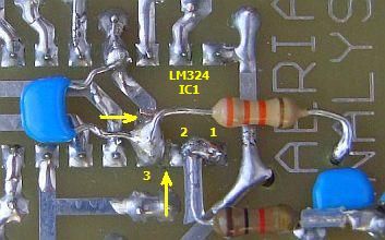 Om IC1d in werking te krijgen moeten met een freesje (b.v. van uw tandarts) van IC1 de printsporen van pootjes 2 en 3 (fig») van elkaar en van massa vrij gemaakt worden. Daarna kunnen 1 en 2 met elkaar verbonden worden.