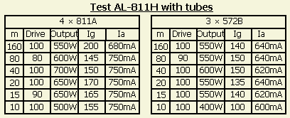 There are regular discussions on forums about whether the 811A tubes can be better replaced by the more robust type 572B. My preference would be given to the latter because I have more experience with it. Therefore, a sumiere test was done with the two types. The numbers are not entirely fair because SWR to 572B's was worser than to original tubes.