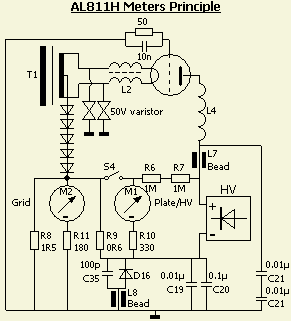 The AL-811H is sold worldwide and is quite a well-built "budget" amplifier, but by no means easy to repair. To dig in the amplifier almost everything has to be deinstalled. Getting to any component is a complete pain, one has to take the back panel off and release enough of the wiring on the large double sised PCB to get aught (e.g. varistor). Repair by a company will be dramatic considering man-hours involved. As radioamateur time is free and one can modify at random time. People of Ameritron are not keen in flawless drawing understandable diagrams. They are even inconsistent when drafting the components. Of the same device circulates different schematics! To more understand the track of the meters I drew the schematic differently. Now one can see how arcing in the tube blows the 50 Ohm resistor and partly conduct one of the varistors. D16 serves as protection of the meters and is also often destroyed by a flash-over.
