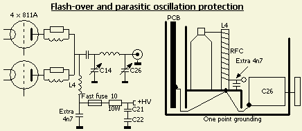 The plate RFC (L4) is decoupled with C21 and C22. Not close to L4 but far away on the PSU board. Was it a decision of the designer, an Amarican ham, or an decision of the production department? I believe it's asking for trouble, and it is better to shorten the RF path by installing an additional 4n7 capacitor at the lower end of L4. Further, the bottom screw of plate capacitor (C26) is attached with a short wire to L4's screw, so that tuning capacitor has a shorter path to the central ground point and not via a long detour.