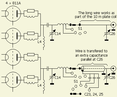 The size of the 10 m coil has become too small due to mounting method. The inductance of the long supply wires can not be ignored. In fact, it's more of a wire with too much inductance then a coil. It can be improved by replace wire from load capacitor (C26) to band switch (S1) by an equally long coaxial cable. The shielding of the cable is only grounded at the side of C26. With this method, the distance between S1 and C26 changed to a small capacitance in parallel with the load capacitor and the total inductance of the coil 10 m is thereby reduced. Without this change no equal output could be obtained at 24.9, 28 and 29 MHz.