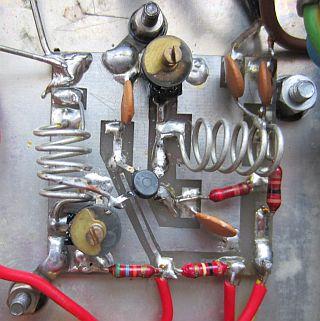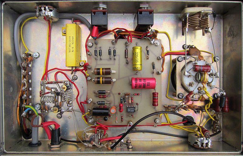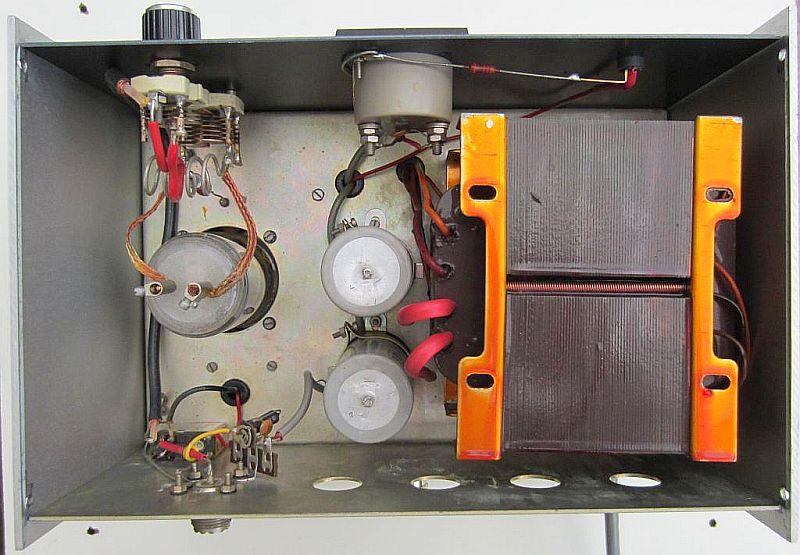 Er is kennelijk niet op de transformator bezuinigd, want het forse type vult de helft van de binnenruimte. Onbelast is de gelijkgerichte spanning 750 Volt met 230 Volt netspanning op de 240 Volt aansluiting. Bij belasting zakt het in naar ongeveer 700 Volt. De trafo is een beetje scheef gemonteerd in verband met de schroefgaten voor andere componenten.
