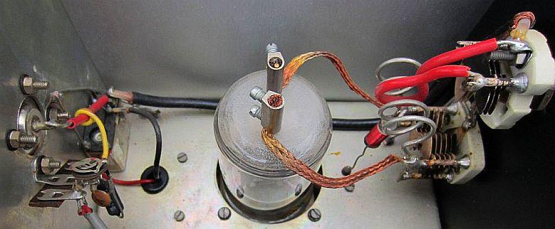 Links de antenne aansluiting met zend/ontvang relais en een gele draad als oppik lus voor de output meting. Rechts de anode kring gemaakt met relatief dun draad. De originele anodeklemmen zijn jammer genoeg vervangen.