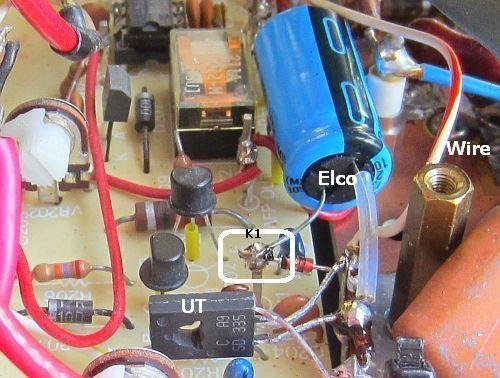 Als de LPF print omhoog geklapt wordt, ziet me op de onderste print een rood-witte draad van een opstaande pin naar het relais. De draad wordt los gemaakt en aan de relaisversneller gesoldeerd. De pin wordt volgens het schema  (fig») verbonden  met het knooppunt van elco en diode; verder wordt de schakeling aan massa gelegd.