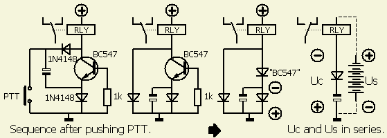 In eerste instantie zal het schema vragen oproepen, daarom is de werking na het indrukken van de druktoets of PTT schakelaar in drie opeenvolgende tekeningen weergegeven.  In de ruststand wordt de elco geladen. Men ziet dan dat door ontlading van de elco over de transistor, het relais kortstondig met ongeveer de dubbele voedingsspanning aangesproken wordt.