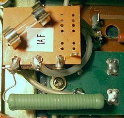 Een extra draadgewonden weerstand en een snelle zekering. Bij een van de eerste FL2100Z's die ik nakeek, trad dat verschijnsel op, maar bleven de buizen heel omdat eerst deze beveiliging aangebracht werd. Verder zijn verbrande contacten van de bandschakelaar een veel voorkomend defect. Als bij voorbeeld de schakelaar op een verkeerde band staat, kunnen de contacten door vonkoverslag beschadigd worden. In de foto rechts was het de eerste keer dat weerstand en zekering aangebracht werden en de foto's boven tonen een later ontwikkelde "slimmere" montage. |