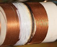 Het kan geen toeval zijn want bij een volgende FL-2100Z begon de anode smoorspoel (fig») te roken toen de versterker afgestemd was op de 17 m band. In dit geval kwam de rook van ongeveer het midden van het onderste segment windingen. Dus niet zoals hiernaast in het grensgebied van twee segmenten. Verder was de output beneden peil. Kennelijk heeft de RFC in één of meer van deze versterkers een serie resonantie die precies in het bereik van de 17 m band valt. Een remedie kan het aanbrengen van extra windingen zijn, zoals hiervoor gedaan is. Omdat de eigenaar niet van plan was de genoemde band te gebruiken, kon dat niet in de praktijk getest worden.