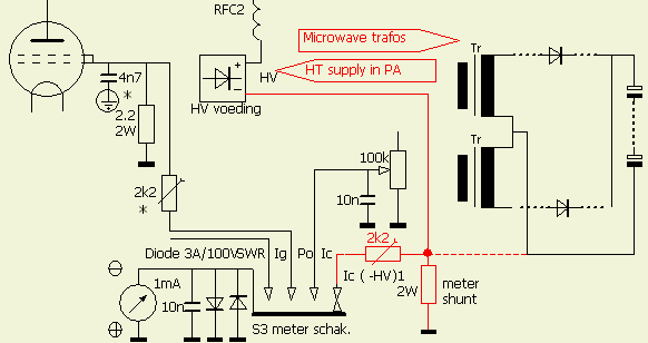 Het systeem met zes of meer 1N4148 diodes in serie voor het meten van de output (Po) gebruik ik al vele jaren in mijn zelfgebouwde dummy-loads. In de tekening («fig) gaat de gelijkgerichte spanning via 220 kΩ naar de 100 kΩ potmeter (fig»). Speciale diodes of compensatie met condensatoren is op HF niet nodig. Het geheel werkt behoorlijk frequentieonafhankelijk en als de 1 mA schaal goed geijkt wordt, is de eigenbouw Wattmeter nauwkeuriger dan vele kastjes van de bekende snoepwinkels. In de lineair dient het systeem als relatieve outputmeter. De aanwijzing op de hogere banden zal wat enthousiaster zijn omdat de impedantie van het meetpunt niet op alle banden 50 Ω is. Door montage en bedrading wordt ongewenst capaciteit en zelfinductie aan de schakeling toegevoegd.