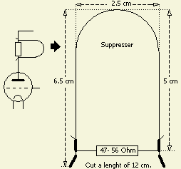 Tussen anode en anode smoorspoel zit meestal een parasietstopper. In mijn ontwerp met één buis was het, mede door goed aarden en ontkoppeling, niet nodig om een parasietstopper in de anode aan te brengen. Bij een buis met een grote versterkingsfactor (3-500Z etc.) en als twee buizen parallel geschakeld worden, is het verstandig om wel parasietstopper te monteren. Het haarpin model van de afbeelding geniet mijn voorkeur.