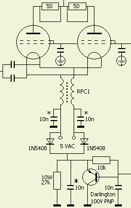 Vaak ziet men in schema's een gloeistroom trafo met een aftakking in het midden om eventuele modulatie met de 50 Hz netspanning te verminderen. In deze versterkers is dat eigenlijk niet nodig, want eventuele brom is door het tegenstation niet waar te nemen. Een kunstmatig middelpunt is te simuleren met twee laagohmige weerstanden of goedkope 3A diodes 1N5408 (fig»). In mijn versterker werden twee diodes aangebracht.