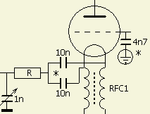 Ingangscircuit met triode of tetrode. Het rooster is voor HF "geaard" door een 4.7 nF condensator.