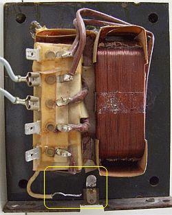 Één kant («fig) van de secundaire winding was bevestigd met het blikpakket en moet los genomen worden voor aansluiting aan een bruggelijkrichter. Al mijn proeven zijn gedaan met losgemaakte verbinding en trafo op de grond of op een houten plankje. De isolatie van draad en spoelvorm ten opzichte van het blikpakket is niet berekend op een brugschakeling. Monteer daarom een magnetrontrafo geïsoleerd op het chassis door middel van een kunststofplaat.