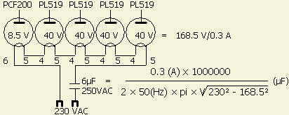 Voor berekening van zo'n condensator staat hiernaast een voorbeeld van een aantal buizen in serie met dezelfde gloeistroom (0.3 A). Als u deze serievoeding toepast moet u bij eventuele reparaties of metingen niet vergeten dat de volle lichtnetspanning op de buisvoet pennen kan staan. Als het chassis steeds met de geelgroene installatiedraad aan het lichtnet verbonden is en u rekening houdt met het voorgaande, dan is dit een goede veilige methode.