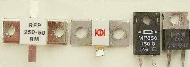 Waarden 25-50-100-150 Ω/25–250 W zijn te koop, een paar voorbeelden (fig»): van links naar rechts, 250 W/50 Ω, 150 W/50 Ω, 30 W/150 Ω en 25 W/50 Ω. Kent Electronics uit Hoek heeft in zijn catalogus een paar geschikte types. U kunt ook forse inductievrije koolweerstanden gebruiken, maar die zijn moeilijk te verkrijgen. Door hun formaat is het niet altijd mogelijk om een in reflectievrije montage uit te voeren waardoor er een ongunstiger SWR op de hogere banden kan ontstaan.