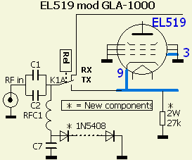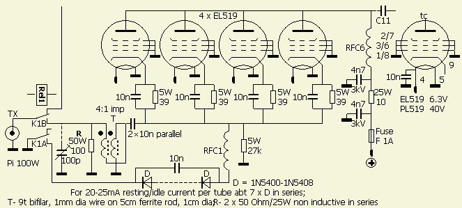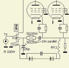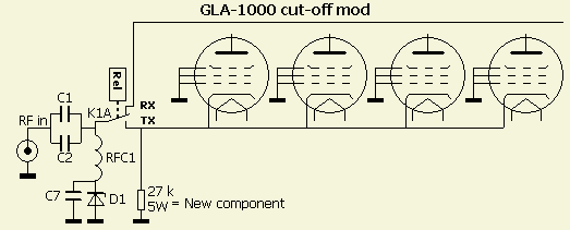Met een 27 kΩ weerstand gemonteerd in de lijn tussen kathodes en massa worden tijdens ontvangst de buizen vrijwel dichtgedrukt. Er loopt dan nog ongeveer 300–500 µA. Als u dat teveel vindt moet er meer dan 27 kΩ gemonteerd worden. Bij zenden overbrugt het relais de weerstand en via smoorspoel RFC1 zorgt zenerdiode D1 voor de juiste ruststroom. Twee parallel geschakelde condensatoren (C1 en C2) tussen de ingangsplug en het relais voorkomen dat gelijkstroom in de zender belandt. Deze schakeling is ook geschikt voor een zelfbouw HF versterker.