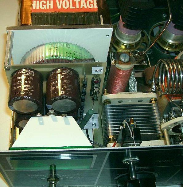 Omdat de transformator na langdurige testen met een anodespanning van 1050 V slechts lauwwarm werd, kwam de gedachte op om de belasting te verhogen door meer zendvermogen uit de versterker te halen. Voor de buizen is dat geen probleem want zij hebben samen een anode dissipatie van 750 W en dat is in feite een overgedimensioneerde combinatie. Meer uitgangsvermogen is alleen mogelijk door verdubbeling van de hoogspanning. Tijdelijk werd er een extern (fig») bouwsel met 6 × 450 V/220 µF elco's en 6 × 1300 V/3 A diodes gemaakt en verbonden met de 750–800 VAC wikkeling van de trafo. Ik schrok eigenlijk van het resultaat want met key-down was de output 700 tot 850 W waarbij de onbelaste anodespanning van 2150 V in elkaar zakte tot 1500–1600 V. Met SSB was de gemiddelde spanning 1900 V en met CW gemiddeld 1850 V. Hier moest een 24 V zenerdiode in de kathode gemonteerd worden voor een ruststroom van ± 100 mA.
