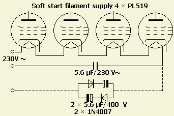 Een andere methode die weinig ruimte inneemt en een gloeistroom trafo uitspaart is serievoeding met een condensator direct op («fig) het lichtnet. Deze methode heeft nog als voordeel dat de buizen een soft-start aanloopfase doormaken.