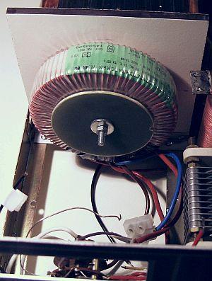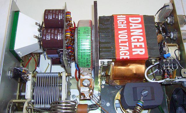 Het was nog een behoorlijk en langdurige klus met passen en meten om voldoende ruimte vrij maken voor alle extra componenten. In het bijzonder voor het groter aantal elco's en de transformator voor de gloeidraden. Daarvoor werd een 230/12 VAC ringkern transformator voor halogeenlampen voorzien van 13 extra windingen zodat met een serieweerstand in de primaire kant de spanning op de "buisvoeten" ingesteld kon worden op de juiste waarde (zie verder). Deze extra trafo werd niet alleen aangebracht voor de juiste spanning, maar ook om de originele trafo te ontlasten omdat die toch al meer te verwerken kreeg met de spanningsverdubbeling voor de hoogspanning. Tussen deze trafo en de meter (fig») kon nog net een print met 6 dikke elco's van 270 µF/450 gemonteerd worden. Zij zijn ongeveer 0.6 cm korter dan 220 µF/450 V typen zodat er aan beide kanten van de print nog een veilige tussenruimte overblijft met transformator en meter.