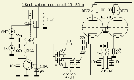 Met een 10 Ω tegenkoppel weerstand krijgen de twee buizen een breedbandige ingangimpedantie (SWR ≤ 1.7) van ongeveer 50 Ω en dat is voor veel transceivers geen probleem. Voor een optimale lineaire werking is het toch beter om een afgestemde ingangskring te hebben. Er werd hier geëxperimenteerd met een variabele ingangskring met één knop voor 10 t/m 80 m. Het systeem, dat gebaseerd is op mijn Fri-match ontwerp, verbetert de SWR tot een nog lagere waarde. Het experimentele ontwerp (fig») werd met een T94-6 ringkern gemaakt. Door vergelijking met de tabel eerder in dit artikel ziet men dat deze experimentele aanpassing nog iets meer uitgangsvermogen oplevert op de lagere banden.