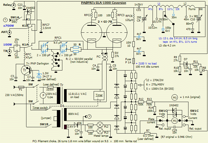 Door PAØZH werd ook (voor iemand) een GLA-1000 omgebouwd met 2 × GI-7B. Hij vroeg mij of de tuning condensator C9 nog geschikt was met spanningsverdubbeling van de HV voeding. Bij mij gaf dat geen probleem maar hij wou dat risico niet nemen toen hij de condensator in levende lijf zag. Zijn korte beschrijving volgt nu.