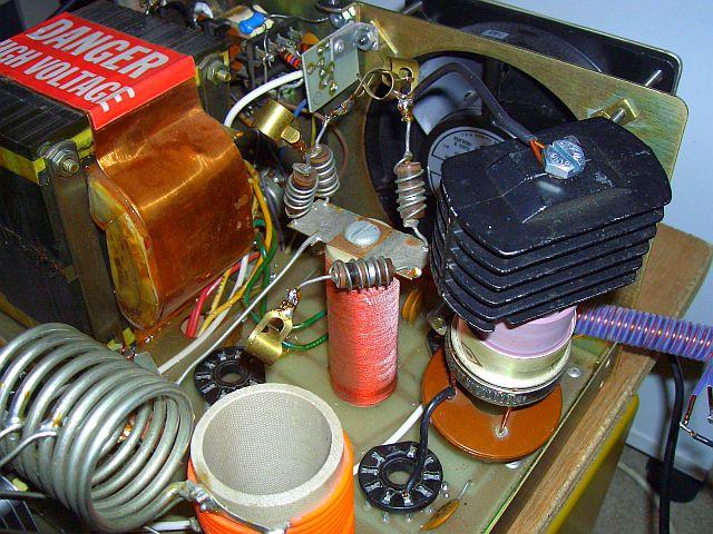 Inbouw en test van 2 × GI-7B. Links is nog net de verplaatste anodesmoorspoel te zien. De ventilator blaast nu wind naar binnen. De koelblokken werden gespoten met hitte bestendige verf.