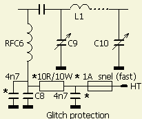 Een ander gebrek is dat de versterker niet beschermd wordt tegen vonkdoorslag (flash-over) in de buizen. Dat komt spontaan en regelmatig voor omdat zij eigenlijk niet ontworpen zijn voor respectievelijk, een permanente hoge anodespanning en als HF versterker. Buizen en diodes (D2-D5) in de HV voeding krijgen in feite een opdonder als de stroom niet op een of andere manier begrensd wordt. Zekering F1 in de 230 VAC netaansluiting piept dan ook regelmatig door. Monteer uit voorzorg («fig) de onderdelen die gemerkt zijn met een ster. Een weerstand in combinatie met zekering beperkt de momentele kortsluiting of onderbreekt een te grote stroom waardoor de buizen vrijwel geen schade oplopen. Condensator C8 is eigenlijk te klein om anodesmoorspoel RFC6 goed voor 80 m te ontkoppelen. Daarom werd een extra 4.7 nF/3 kV condensator parallel aan C8 geplaatst.