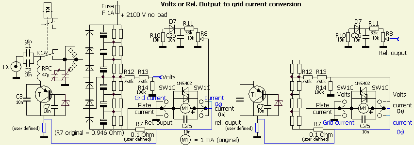 Het meetsysteem is grotendeels hetzelfde gebleven met gebruik van de originele componenten en met als extra beschermingsdiodes over de meteraansluitingen. Merk op dat slechts de halve hoogspanning aangewezen wordt zodat men in gedachten het getal op de schaal met twee moet vermenigvuldigen. Persoonlijk vind ik een nauwkeurige weergave van de hoogspanning niet belangrijk, een indicatie met bij voorbeeld een LED dat de spanning aanwezig is, zou voor mij al voldoende zijn. Weerstand R7 (0.946 Ω) voor het meten van de anodestroom bleek te klein te zijn voor de (mijn) originele 1 mA meter want er werd een te lage stroom aangewezen. Daarom werd de waarde verhoogd naar 0.1 Ω om de schaal kloppend te krijgen.